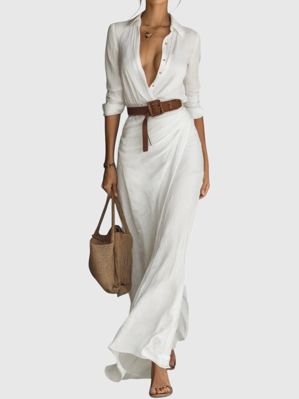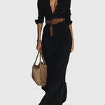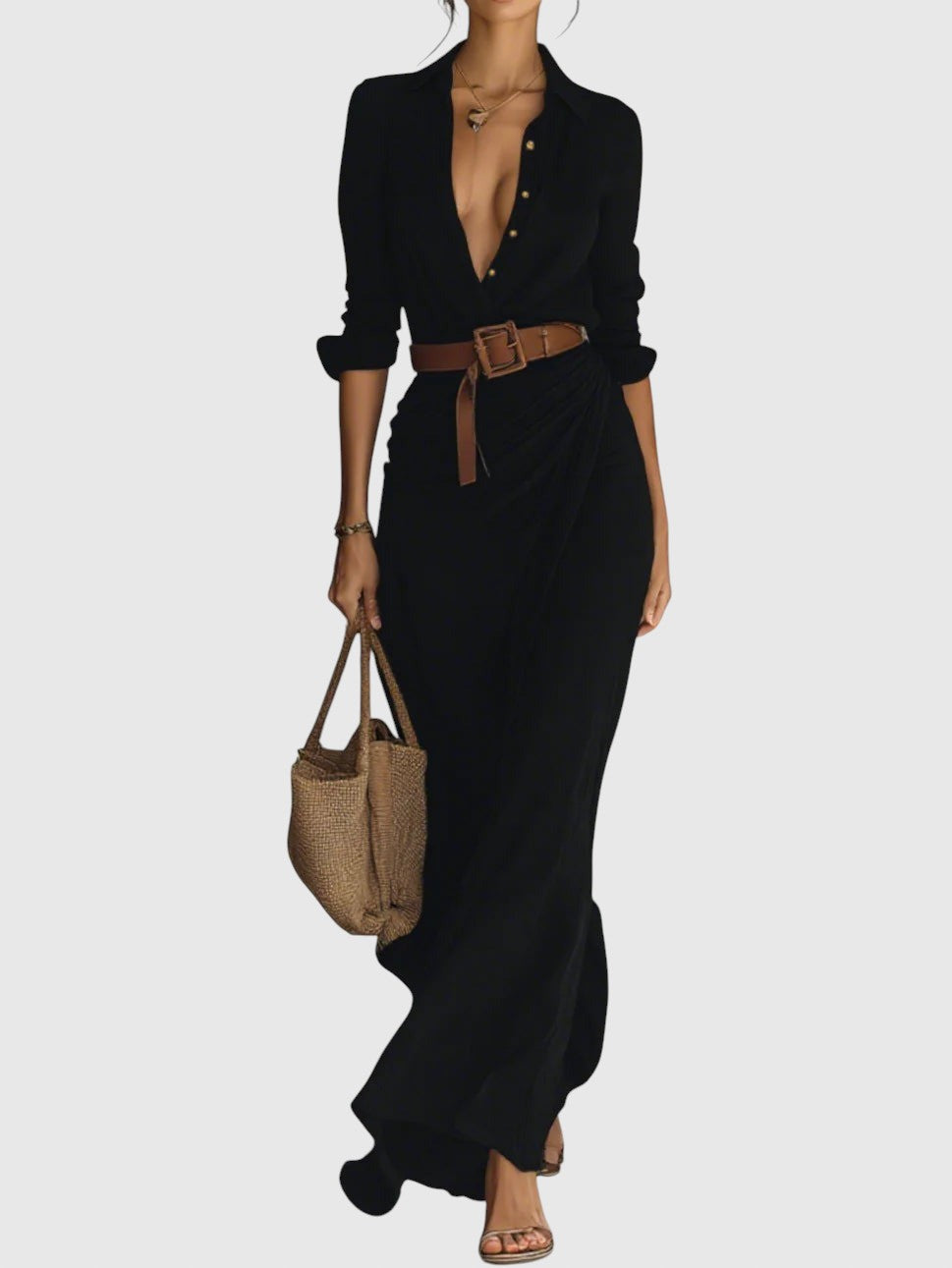 Gara kleita ar izsmalcinātu dizainu, kas izgatavota no viegla un mīksta auduma, kas nodrošina dabisku kustību un perfektu piegulumu. Dziļš "V" veida kakla izgriezums, kas izceļ kaklu, garas piedurknes ar aprocēm un apļveida detaļa svārkos, kas rada sievišķīgu un satriecošu izskatu. Komplektā ietilpst josta, kas uzsver vidukļa līniju un izceļ siluetu. Lieliski piemērots gan ikdienas, gan īpašiem gadījumiem.