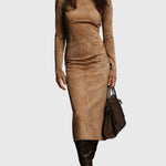 Kleita Ava | Suede Midi kleita piešķir ikdienas apģērbam mūžīgu eleganci. Augstais kakla izgriezums, graciozs midi garums un gluda, zamšādai līdzīga tekstūra piedāvā siltu, modernu izsmalcinātību. Tā ir radīta, lai to viegli izceltu, nemanāmi pārejot no dienas uz izsmalcinātiem vakariem — komforts, pārliecinātība un elegancija – viss vienā, bez piepūles.
