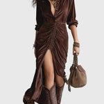 • Grezns velūra audums:** Mīksts un zīdains, ar elegantu drapējumu izsmalcinātam komfortam.**
