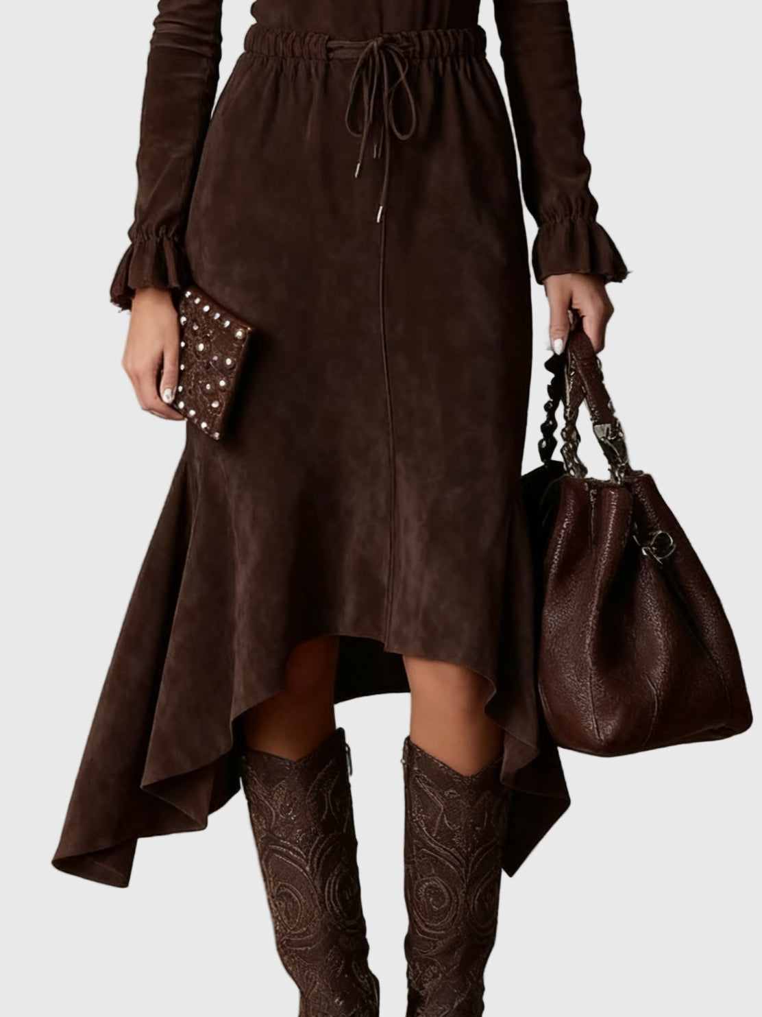 Isla | Zamšādas Midi kleita apvieno bagātīgu, mīkstu zamšādas tekstūru ar izsmalcinātu, sievišķīgu formu. Ar elegantu pusaugstu kakla izgriezumu, gludām aprocēm un aizsienamu jostu tā uzsver stilu un komfortu. Asimetriskā apakšmala piešķir burvīgu kustību — izsmalcināta izvēle vakara pasākumiem, īpašiem gadījumiem vai elegantiem dienas mirkļiem.